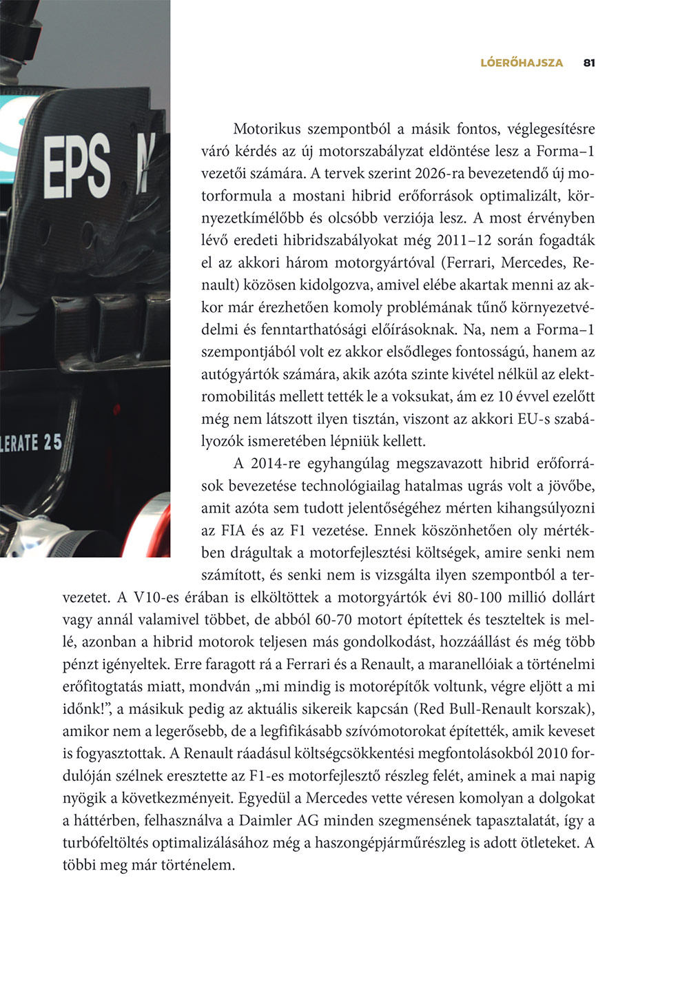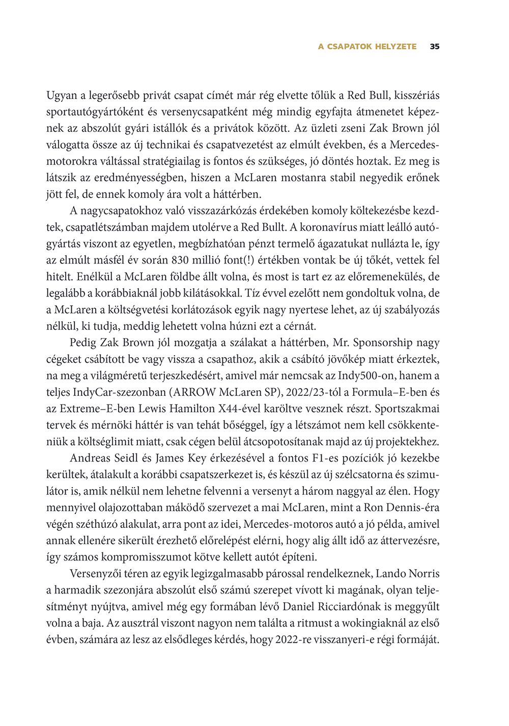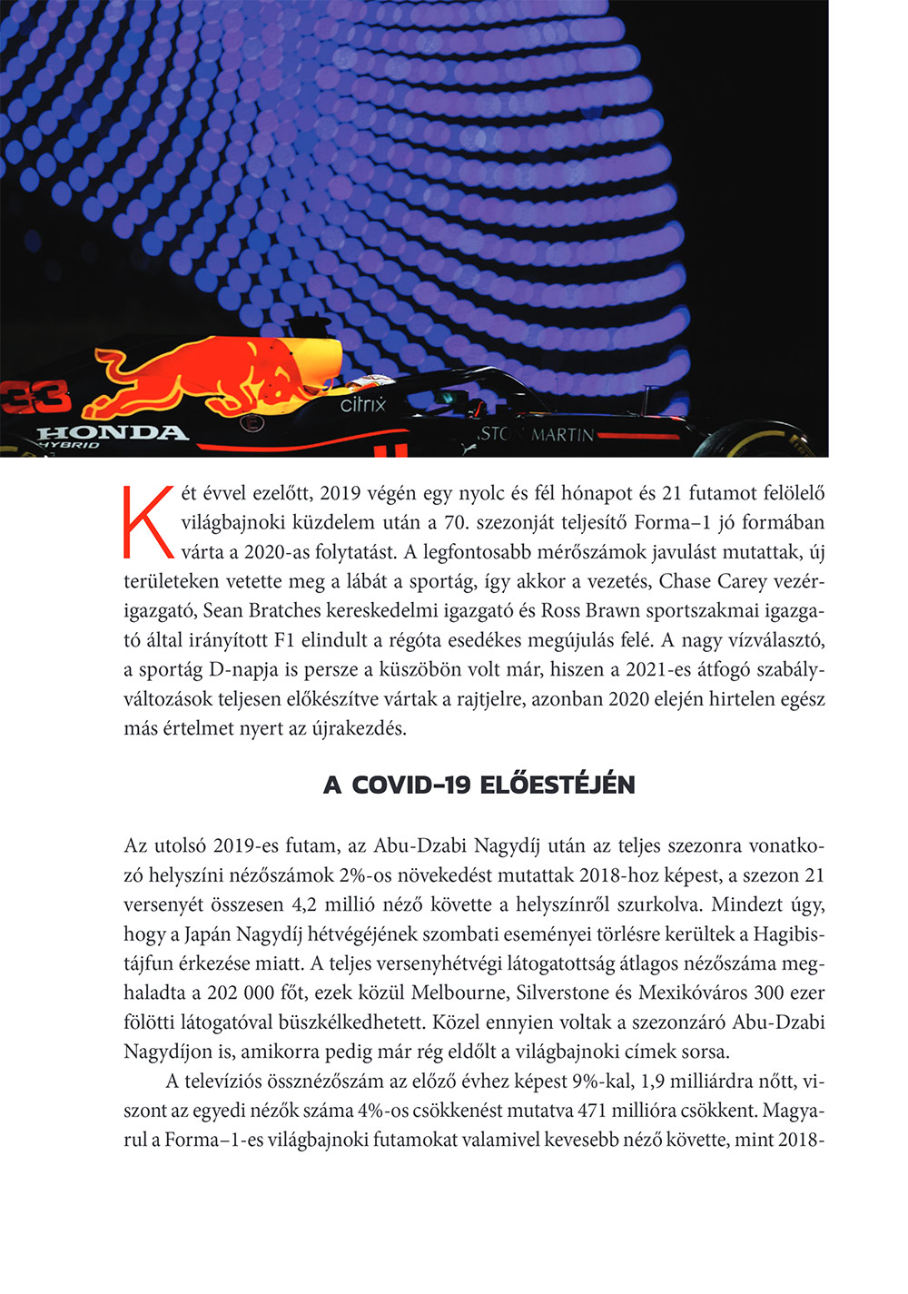 • A Forma–1 2022-től vadonatúj korszakba lépett, miközben a technológiai fejlődés továbbra és elképesztő mértékű a háttérben. Az F1 sikeresen átlavírozott a koronavírus hullámain, ám idéntől a csapatokat már a költségvetési limit korlátozza, miközben az autóipar és a környezetvédelem változásait nem lehet figyelmen kívül hagyni a sportág jövőjének tervezésekor.